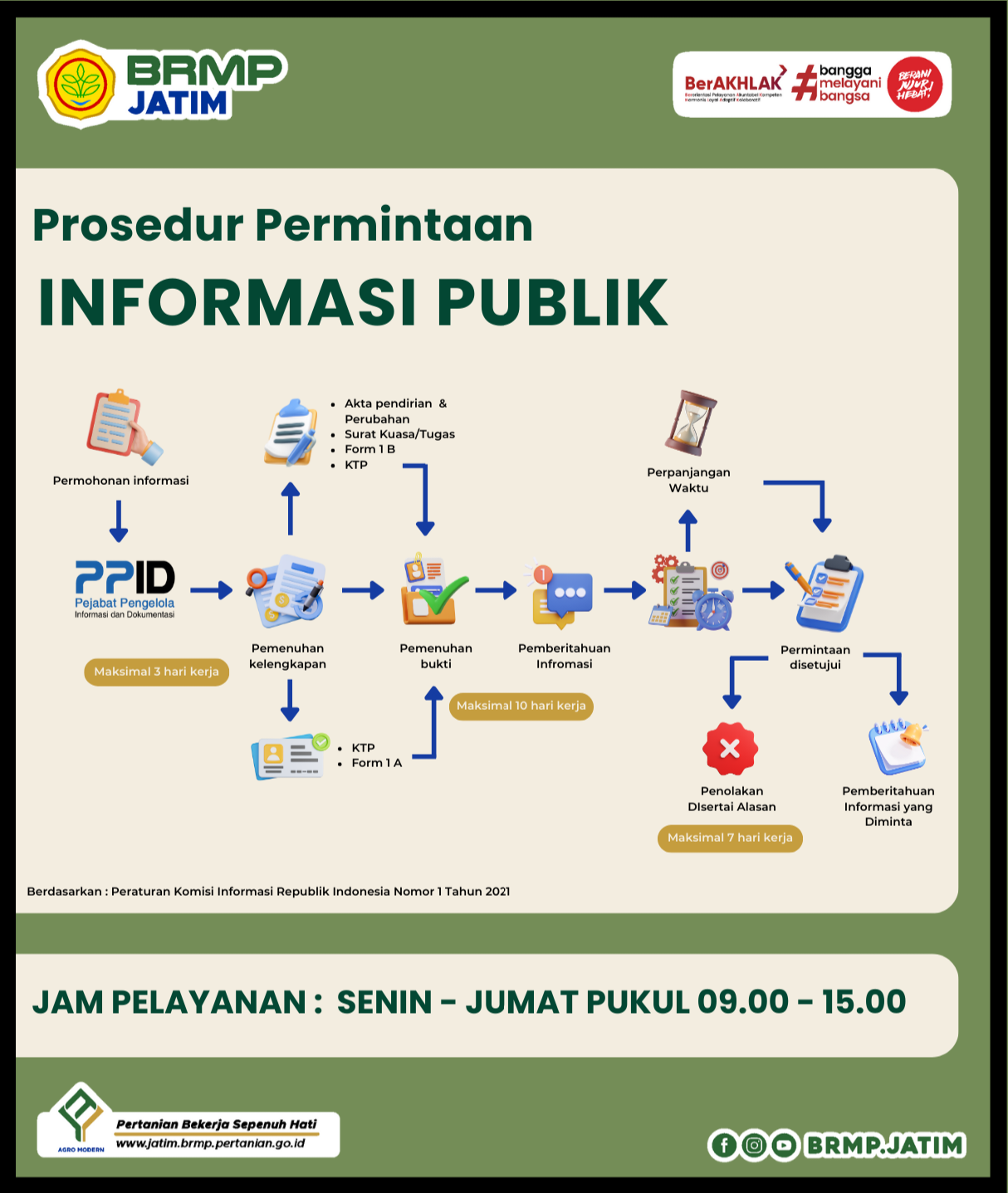 Prosedur Pelayanan Informasi Publik lingkup Badan Perakitan dan Modernisasi Pertanian disusun berdasarkan Peraturan Menteri Pertanian Nomor 32/Permentan/OT.140/5/2011 tentang Pengelolaan dan Pelayanan Informasi Publik di Lingkungan Kementerian Pertanian dan Peraturan Komisi Informasi Republik Indonesia Nomor 1 Tahun 2021 tentang Standar Layanan Informasi Publik.